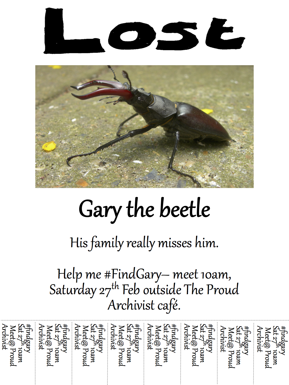 March 02, 2016 Find Gary March 02, 2016/ NIU Lost posters asking the public to join a search to find Gary the Beetle who has gone missing.