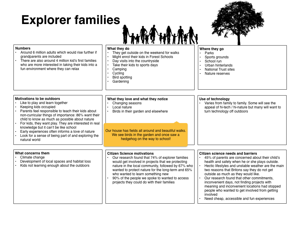 /Families with young kids (under 10) lot of interest in being outside but often lack imagination or ideas where to start. Looking for fun, simple, playful ideas designed around both kids and parents is key - something for everyone to do. Role of content and stories to inspire is key. Weekly updates and nudges. Open to the idea that their contributions are helping a bigger issue.
