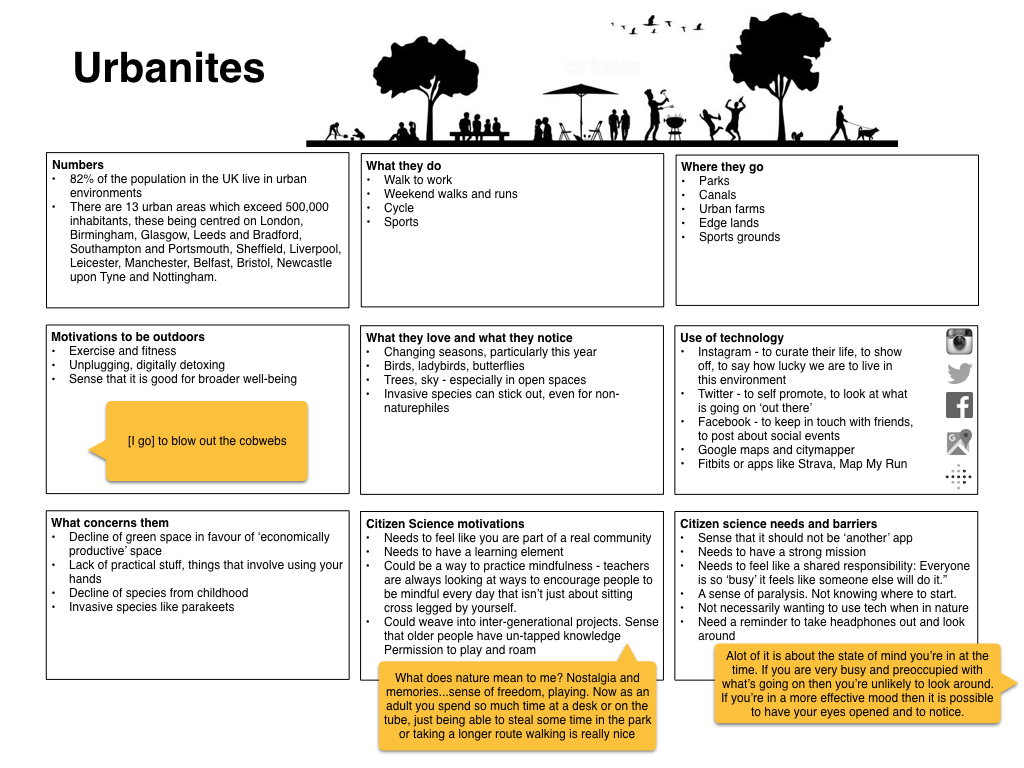 Big users of social technologies. Capturing ‘life’ through tweets/photos/Facebook. Living in increasingly nature starved zones. Need hooks that can integrate with current behaviours. Increasing fear over climate change, pollution, air quality, wellbeing, and lack of green spaces.